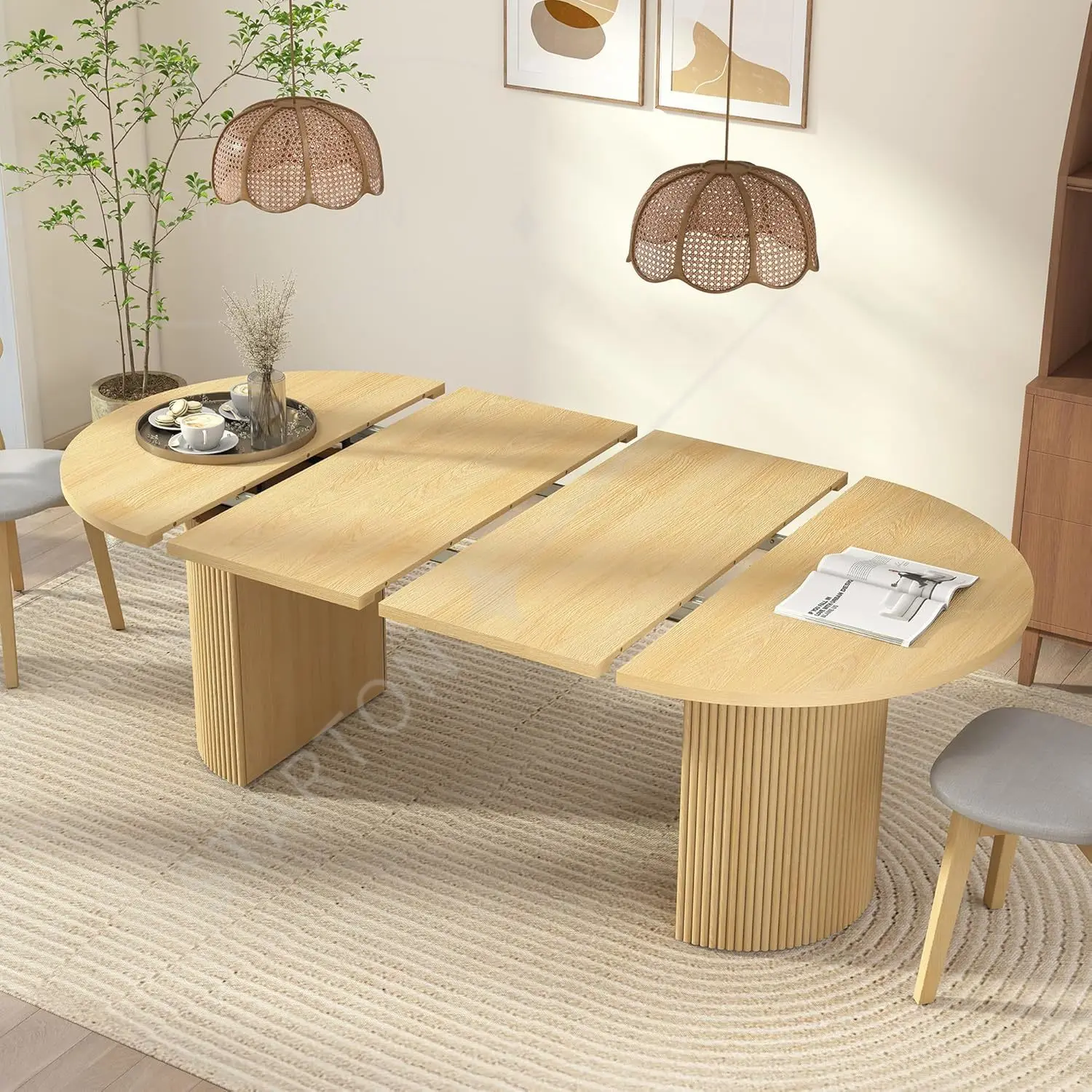 Table de cuisine ronde extensible avec piétement cannelé, style ferme moderne, table de salle à manger extensible de 104 cm à 198 cm pour 4 à 8 personnes